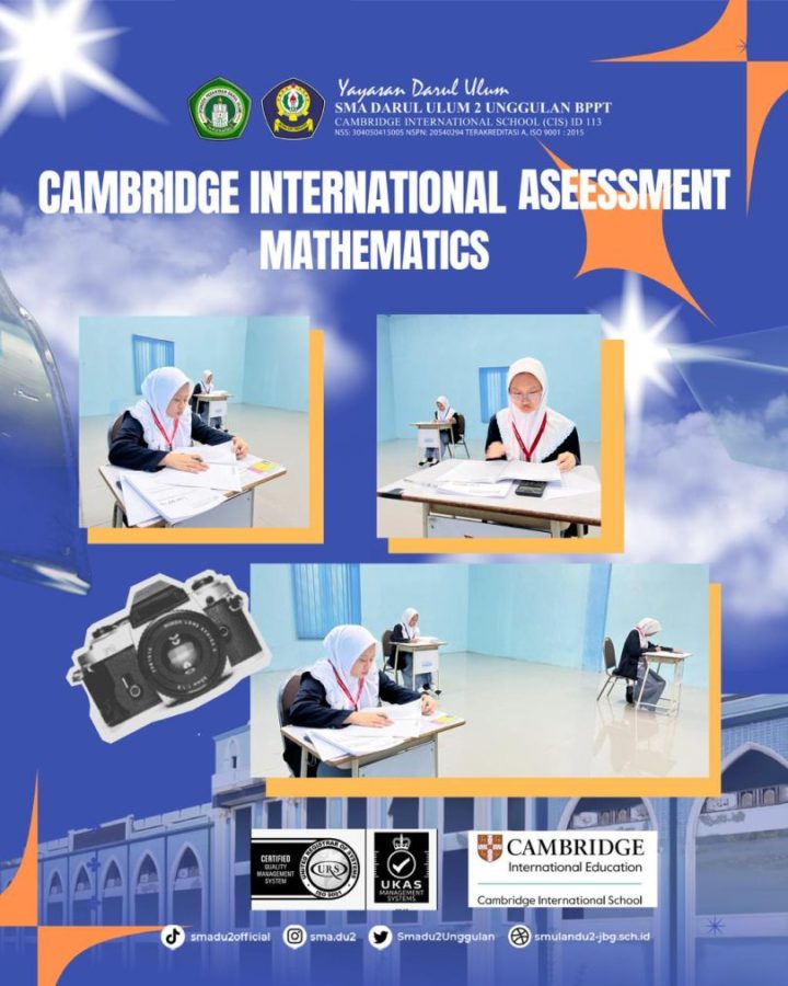 SMA Darul Ulum 2 Unggulan BPPT kembali menyelenggarakan Ujian Sertifikasi Cambridge periode Oct/Nov 2025. Periode ini diselenggarakan pada 25 September – 13 November 2025. Kegiatan ini diikuti oleh 62 peserta yang terdiri dari dua level, yaitu Advanced Subsidiary Level (AS level) dan International General Certificate of Secondary Education (IGCSE level). AS level terdiri atas subjek Mathematics AS Pure (9709 Component Code 12 dan 22), Mathematics AS Mechanics (9709 Component Code 12 dan 42) dan Physics AS (Component Code 12, 22, dan 33). Level IGCSE terbagi dalam subjek Mathematics, Biology, Physics, Chemistry, Economics, Geography, dan ICT.
