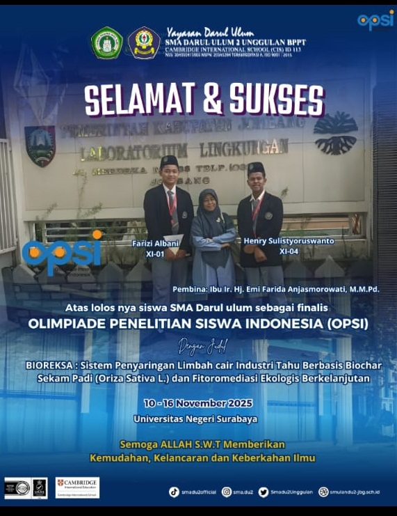 Jumat, 24 Oktober 2025 — Kabar membanggakan kembali datang dari SMA Darul Ulum 2 Unggulan BPPT. Dua siswa berprestasi, Farizi Albani (kelas XI-01) dan Henry Sulistyoruswanto, berhasil lolos seleksi Olimpiade Penelitian Siswa Indonesia (OPSI) 2025 yang diselenggarakan oleh Pusat Prestasi Nasional. Keduanya akan mewakili sekolah dalam ajang bergengsi tingkat nasional yang akan berlangsung pada 10–16 November 2025 di Universitas Surabaya (UBAYA).