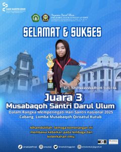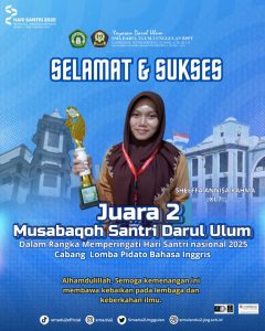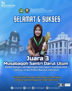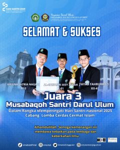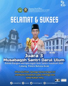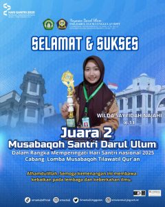Dalam rangka memperingati Hari Santri Nasional 2025, para siswa SMA Darul Ulum 2 Unggulan BPPT kembali menorehkan prestasi gemilang pada ajang Musabaqoh Santri Pondok Pesantren Darul Ulum. Kegiatan ini menjadi wadah bagi para siswa untuk menunjukkan kemampuan terbaiknya di berbagai cabang Musabaqoh. Dalam ajang tersebut, siswa-siswi SMA Darul Ulum 2 Unggulan BPPT berhasil meraih sejumlah penghargaan di antaranya :