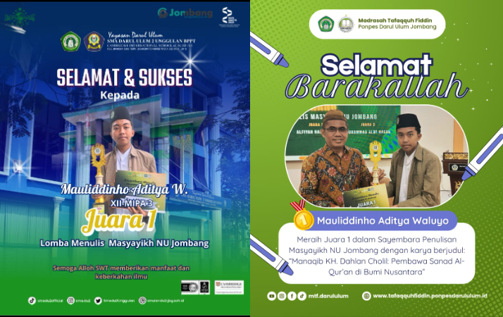 satu siswa terbaik, Mauliddinho Aditya Waluyo, kelas XII-03, berhasil meraih Juara 1 dalam Sayembara Menulis Masyayikh NU Jombang dengan Karyanya berjudul “Manaqib KH.Dahlan Cholil : Pembawa Sanad Al-Qur’an di Bumi Nusantara” dinilai memiliki kedalaman analisis, gaya bahasa yang kuat, serta relevansi dengan semangat perjuangan para masyayikh NU. Prestasi ini sekaligus menunjukkan bahwa siswa SMA Darul Ulum 2 Unggulan BPPT tidak hanya unggul dalam bidang sains dan teknologi, tetapi juga memiliki kecakapan literasi dan keagamaan yang tinggi.