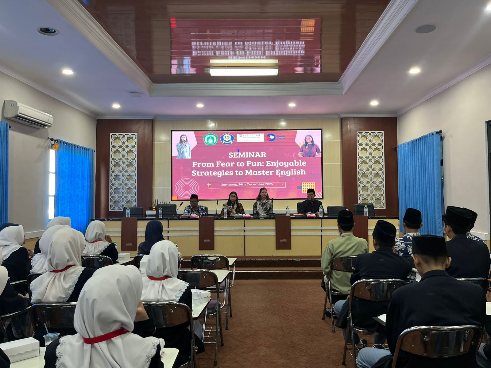 Jombang, 14 Desember 2025 — SMA Darul Ulum 2 Unggulan BPPT mendapatkan kehormatan dengan kehadiran dua relawan Peace Corps dari United States of America, Ms. Lee dan Ms. Lucy. Kunjungan ini merupakan bagian dari upaya SMA Darul Ulum 2 Unggulan BPPT untuk meningkatkan kemampuan berbahasa Inggris siswa melalui interaksi langsung dengan penutur asli. Kedua relawan tersebut memimpin sebuah seminar interaktif yang bertajuk “From Fear to Fun: Enjoyable Strategies to Master English,” yang disambut antusias oleh para siswa.