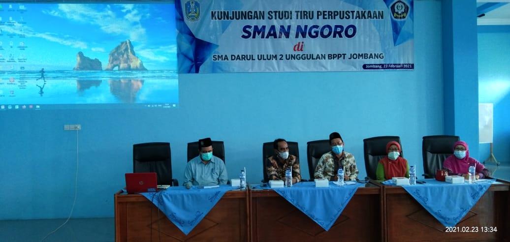 Sebagai instansi pendidikan yang sudah mendapatkan Akreditasi Perpustakaan dengan nilai A, SMA Darul Ulum 2 Unggulan BPPT Jombang siap menerima kunjungan studi tiru perpustakaan dari sekolah-sekolah lain di Jombang yang ingin menyiapkan perpustakaannya untuk mengikuti program Akreditasi Perpustakaan yang diselenggarakan oleh Perpustakaan Nasional Republik Indonesia melalui Lembaga Akreditasi Perpustakaan. Salah satu kunjungan datang dari SMA Negeri Ngoro pada tanggal 23 Februari 2021, dimana Bapak Kepala SMA Negeri Ngoro (Sujiono, S.Pd.,M.Si) didampingi oleh 4 orang di Jajaran pimpinan (Drs. Sukemi, Drs, Sujanto, Bahrul Uddin, S.Pd., & Naning Muflihah, S.Pd.), 1 orang Kepala Perpustakaan (Drs. Sugiyoto), 1 orang Guru (Eko Suprihono, S.Pd.), 1 orang Kasubag Tata Usaha (Saiful, S.Sos) beserta 3 petugas perpustakaan (Luluk Zakiyah, A.Ma.Pust., Muhammat Agus Elyas, S.Kom., Hadi Putra Zuhri, S.Pd.) yang semuanya sangat bersemangat dalam mengikuti kegiatan ini. Agenda pada kegiatan ini diawali dengan persiapan, pembukaan, sambutan Kepala SMA Darul Ulum 2 Unggulan BPPT Jombang, Sambutan Kepala SMA Negeri Ngoro, Paparan tentang teknik pemenuhan Instrumen Akreditasi Perpustakaan oleh Kepala perpustakaan SMA Darul Ulum 2 Unggulan BPPT Jombang, dilanjutkan dengan kunjungan ke perpustakaan dan diakhiri dengan sesi dokumentasi/foto bersama. Kegiatan ini dimulai pukul 13.00 dan berakhir pukul 16.00.