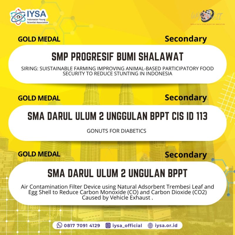Jum’at, 14 Juni 2024 SMA Darul Ulum 2 Unggulan BPPT mendapatkan 2 gold medal di ajang LKTI Internasional World Youth Stem Invention Innovation (WYSII) Malaysia tahun 2024. Event afiliasi IYSA dari Malaysia, event ini diselenggarakan secara online pada May 31st – June 8th 2024. Ikatan Ilmuwan Muda Indonesia (IYSA) merupakan lembaga yang bergerak dalam pengembangan potensi, bakat, dan kreativitas mahasiswa Indonesia dengan memberikan kesempatan kepada mereka untuk mengikuti kompetisi ilmiah dan non-kompetitif serta kegiatan di dalam dan luar negeri. Alhamdulillah peserta didik SMA Darul Ulum 2 Unggulan BPPT mendapatkan 2 gold medal.