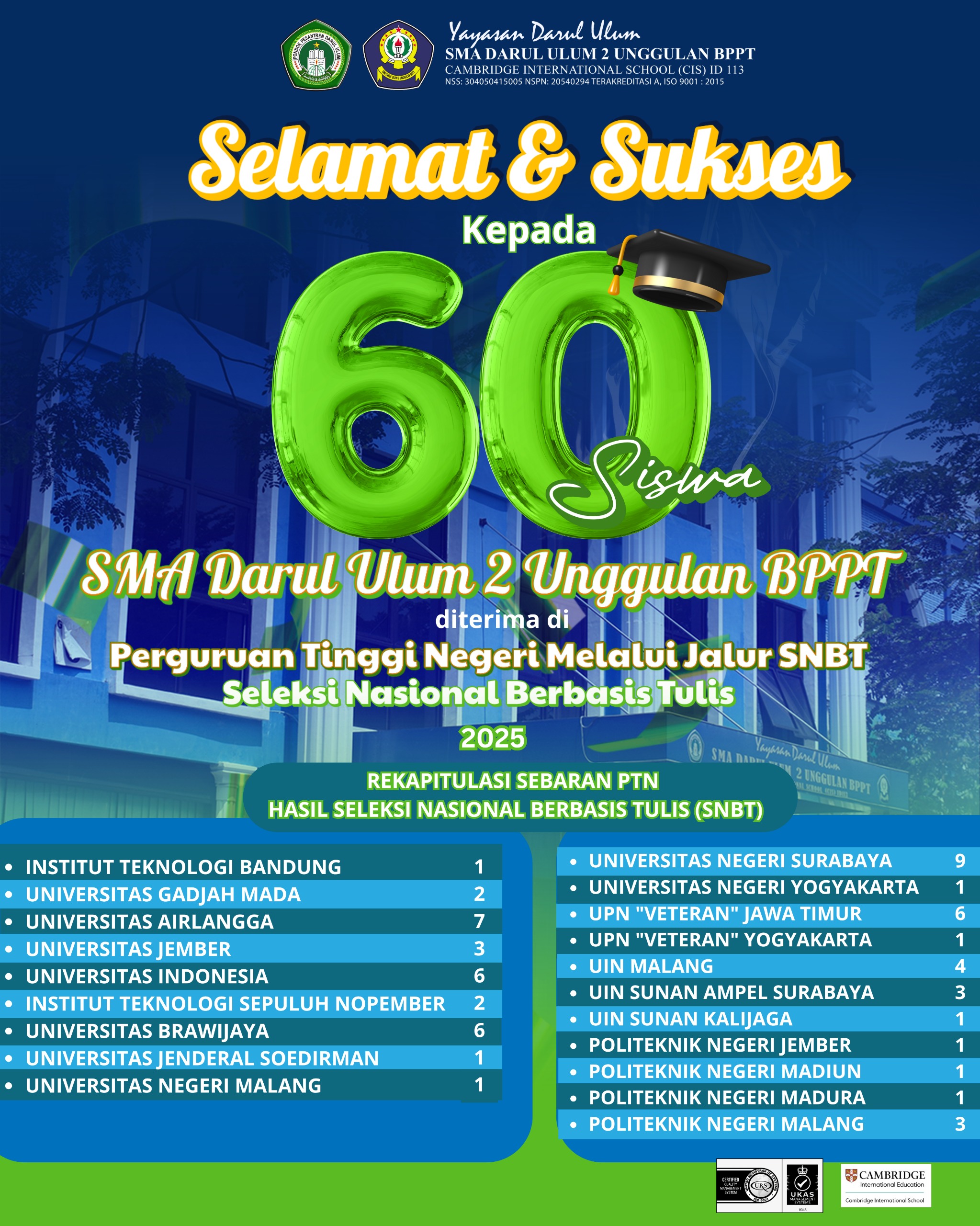 Segenap keluarga besar SMA Darul Ulum 2 Unggulan BPPT mengucapkan selamat dan sukses kepada siswa-siswi yang telah diterima di Perguruan Tinggi Negeri melalui Jalur SNBT (Seleksi Nasional Berbasis Tulis) Tahun 2025.