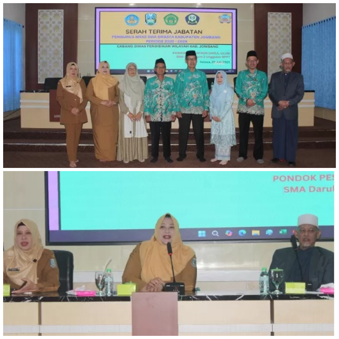 Serah terima jabatan pengurus Musyawarah Kerja Kepala Sekolah (MKKS) SMA Swasta Kabupaten Jombang periode 2025-2029, digelar di SMA Darul Ulum 2 Unggulan BPPT Pondok Pesantren Darul Ulum Rejoso, Senin (22/7).