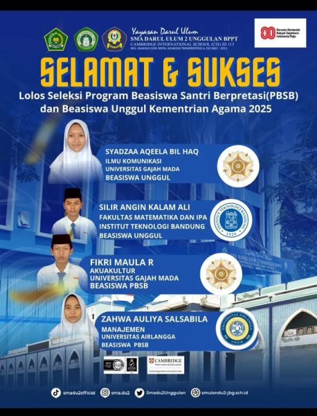 Jombang — Kabar membanggakan datang dari SMA Darul Ulum 2 Unggulan BPPT. Empat siswa terbaiknya berhasil lolos dalam Seleksi Program Beasiswa Santri Berprestasi (PBSB) dan Beasiswa Unggul Kementerian Agama RI tahun 2025. Keempat siswa tersebut adalah Syadzaa Aqeela Bil Haq, Silir Angin Kalam Ali, Fikri Maula R dan Zahwa Auliya Salsabila. Mereka akan melanjutkan studi di berbagai perguruan tinggi ternama di Indonesia dengan dukungan penuh dari program beasiswa bergengsi tersebut.
