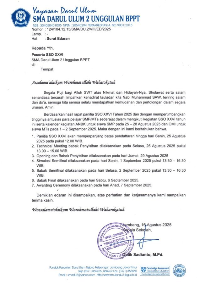 Berdasarkan hasil rapat panitia SSO XXVI Tahun 2025 dan dengan mempertimbangkan tingginya antusias para pelajar SMP/MTs sederajat dalam mengikuti kegiatan SSO XXVI tahun ini serta kalender kegiatan ANBK untuk siswa SMP pada 25 – 28 Agustus 2025 dan OMI untuk siswa MTs pada 1 – 2 September 2025. Maka dengan ini kami beritahukan bahwa,